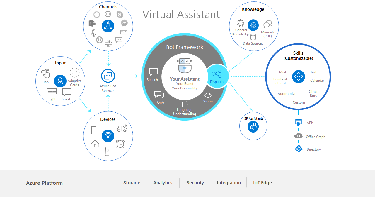 The Virtual Assistant solution is built on the Azure Bot Service, Language Understanding Cognitive Service, Unified Speech along with a broad set of supporting Azure components meaning that you benefit from the Azure global infrastructure including ISO 27018, HIPAA, PCI DSS, SOC 1, 2 and 3 certification.